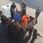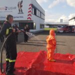 Bei der Station „Schadstoff“ musste ein leckgeschlagener Tank mit „Gefahrengut“ erkannt und entsprechend abgesichert werden. Die Kinder hatten hier die Möglichkeit einen Schutzanzug anzuprobieren und wurden anschließend in einer selbsterrichteten Dekontaminationswanne „gereinigt“.