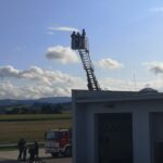 Bei der Station „Drehleiter“ ging es ab in luftige Höhen. Vom Dach der Fahrzeughalle mussten die Kinder eine „verunglückte Person“ mittels Drehleiter retten.