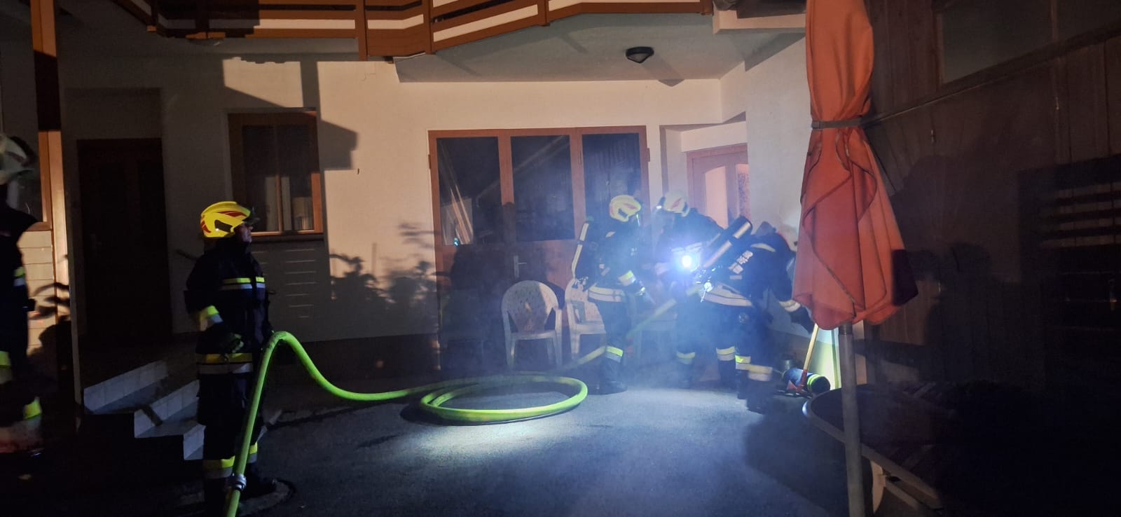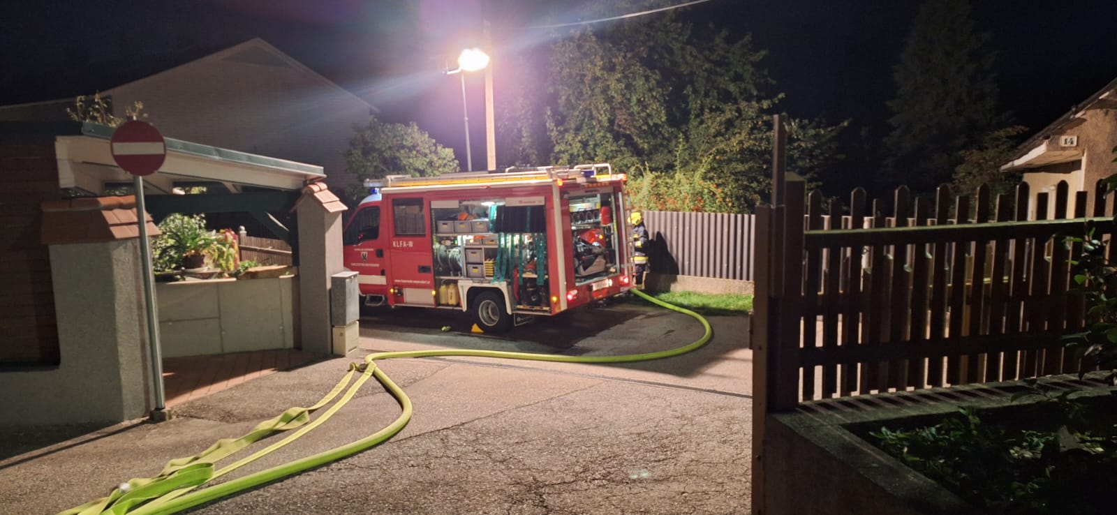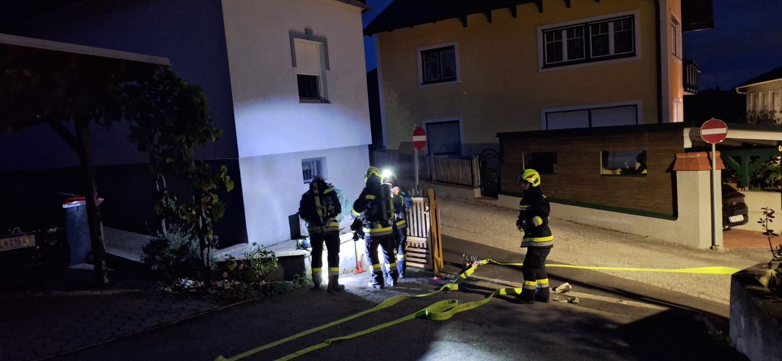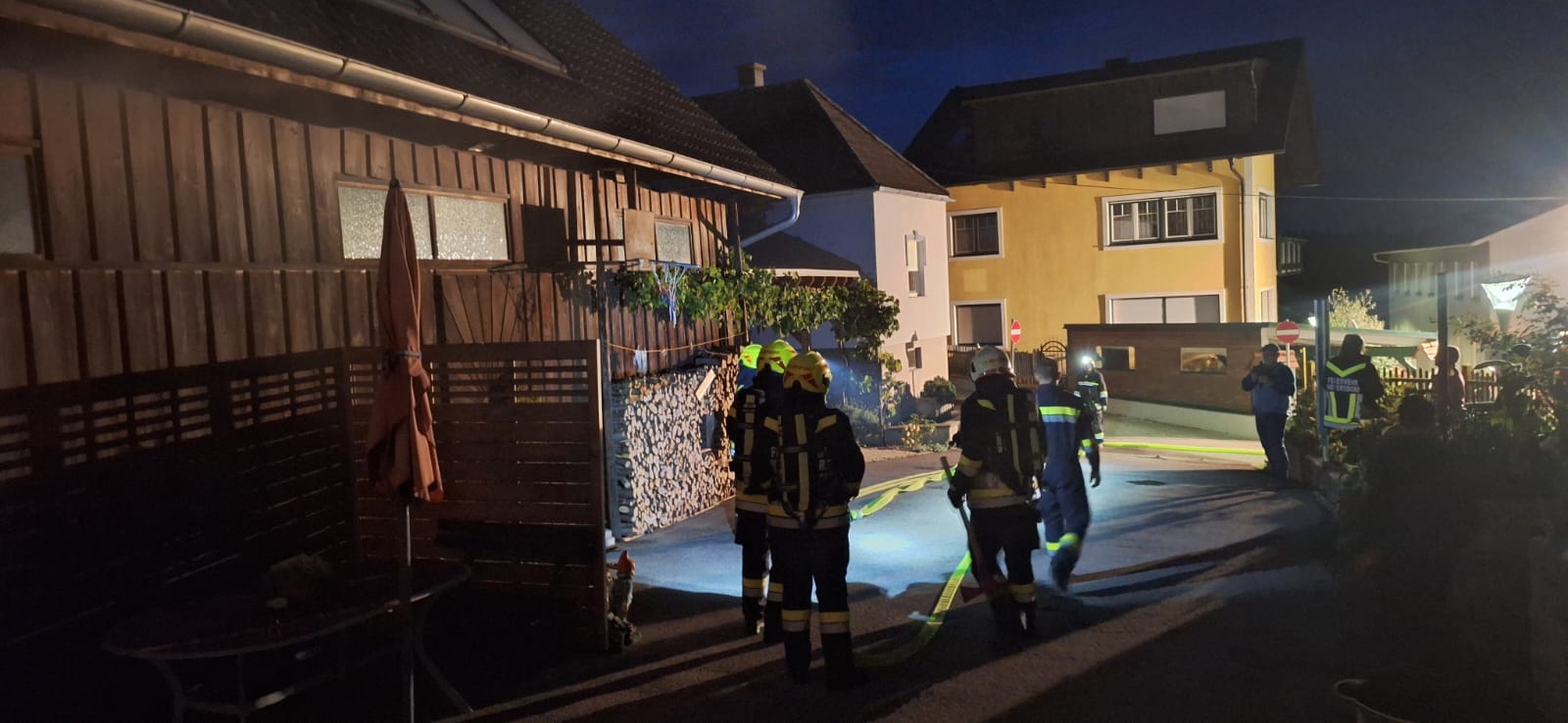 Zwischenzeitig wurde eine 2. Löschleitung vom Hydranten in der Nähe aufgebaut. Damit wurde von außen das Wohngebäude geschützt und ein übergreifen der Flammen konnte verhindert werden.