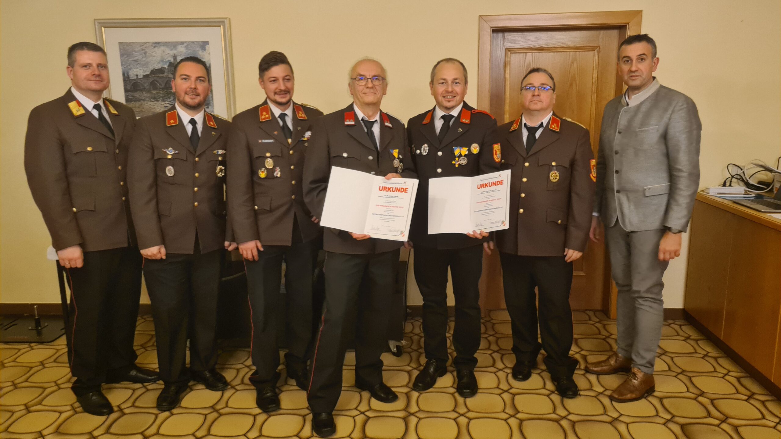 Im Zuge der Ehrungen wurden Thomas Moser und Anton Lenk die Ehrenmedaillen des Landes NÖ für den Hochwassereinsatz im Herbst 2024 überreicht.